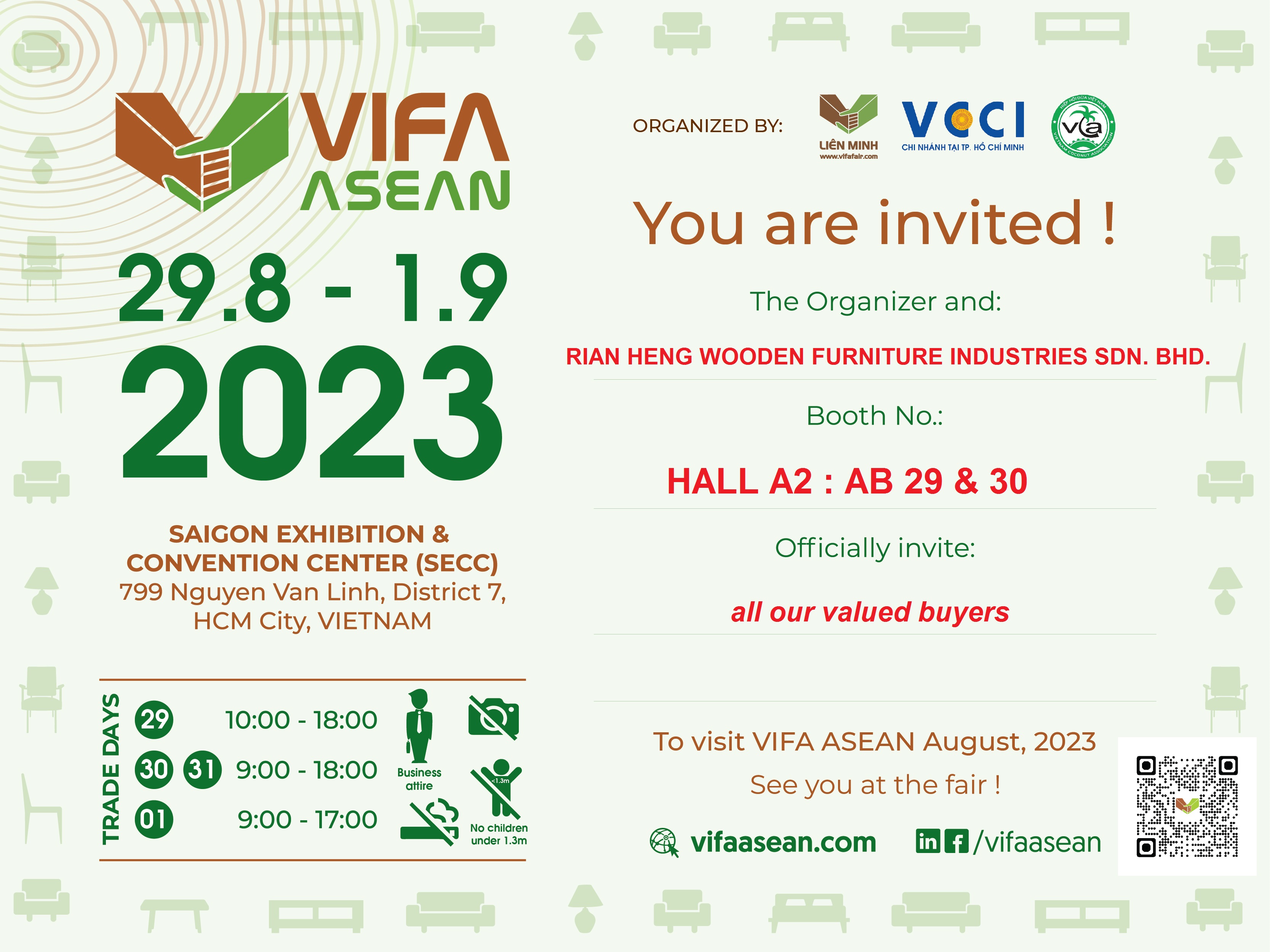 We Had Participated VIFA ASEAN 2023 VIFA ASEAN 2023, SECC, VIETNAM BOOTH HALL A2: AB 29 & 30 (DINING & UPHOLSTERED BED) Date : 29 Aug – 1 Sept 2023 Booth : HALL A2: AB 29 & 30 Location : SECC (Vietnam)